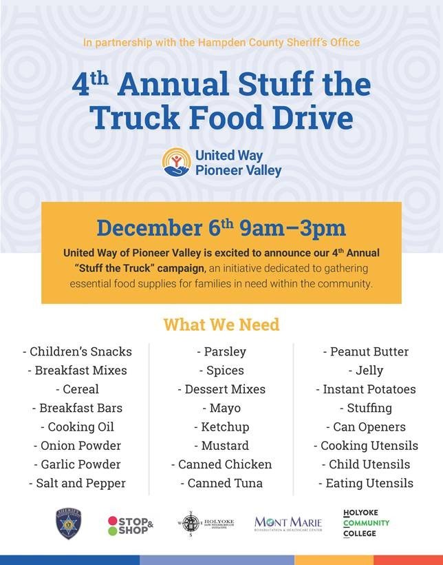 In partnership with the United Way of Pioneer Valley, we will be holding our 4th Annual Food Drive at the two Stop & Shop locations in Holyoke on Saturday, December 6th from 9am to 3pm.